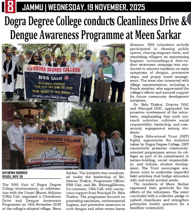 Dogra Degree College conducts Cleanliness Drive & Dengue Awareness Programme at Meen Sarkar