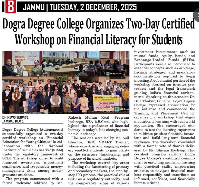 Dogra Degree College Organizes Two-Days Certified Workshop on Financial Literacy for Students