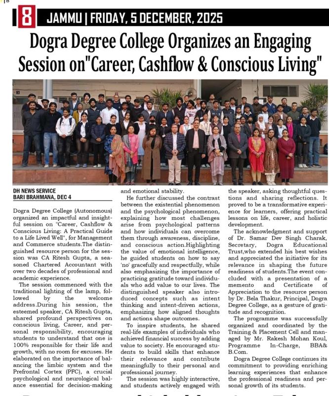 Dogra Degree College Organizes an Engaging Session on "Career, Cashflow & Concious Living"