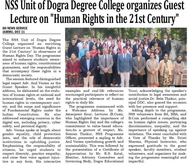 NSS Unit of Dogra Degree College Organizes Guest Lecture on "Human Rights in the 21st Century"