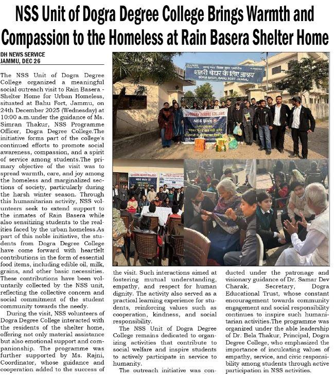 NSS Unit of Dogra Degree College Brings Warmth & compassion to the Homeless at Rain Basera Shelter Home